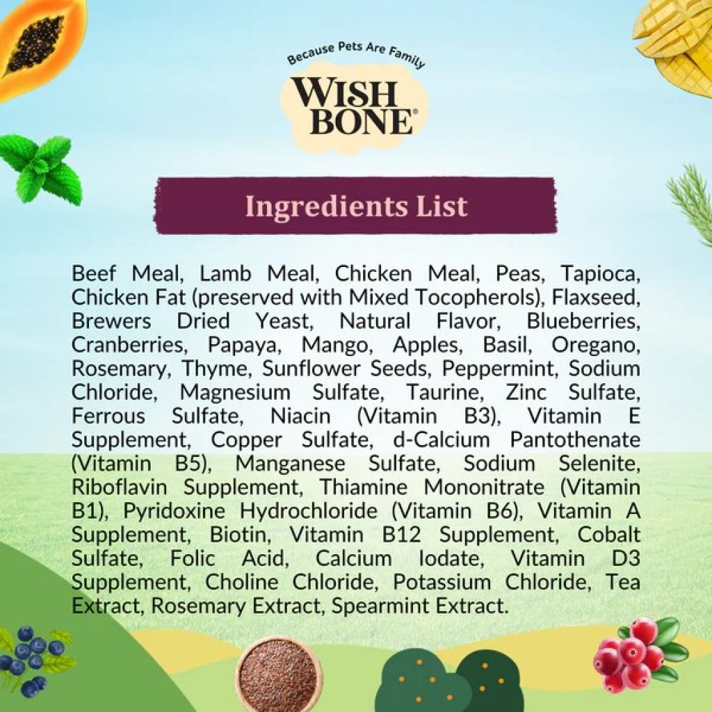 牛肉粉、羊肉粉、雞肉粉、豌豆、木薯、雞脂(用混合生育酚保存)、亞麻籽、啤酒乾酵母、天然調味料、藍莓、蔓越莓、木瓜、芒果、蘋果、羅勒、牛至、迷迭香、百里香、葵花籽、薄荷、維生素氯化鈉、硫酸鎂、牛磺酸、硫酸鋅、硫酸亞鐵、百里香、葵花籽、薄荷、維生素氯化鈉、硫酸鈉、牛磺酸硫酸鈣素、硫酸亞鐵、維生素 B3)、維生素 B3)、牛磺酸硫酸鈣素、硫酸亞鐵、維生素 B3)、維生素 B3)、牛磺酸硫酸鈣素、硫酸亞鐵、維生素 B3)、維生素 B3)、糖磺酸硝酸硫胺素(維生素 B1)、鹽酸吡哆醇(維生素 B6)、維生素 A 補充劑、生物素、維生素 B12 補充劑、硫酸鈷、葉酸、碘酸鈣、維生素 D3 補充劑、氯化膽鹼、氯化鉀、茶萃取物、迷迭香萃取物、留蘭香萃取物。
