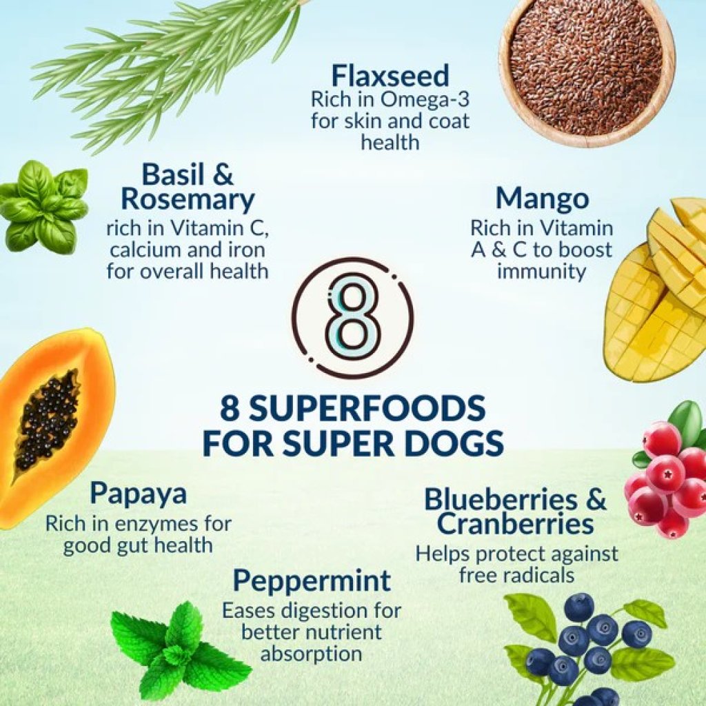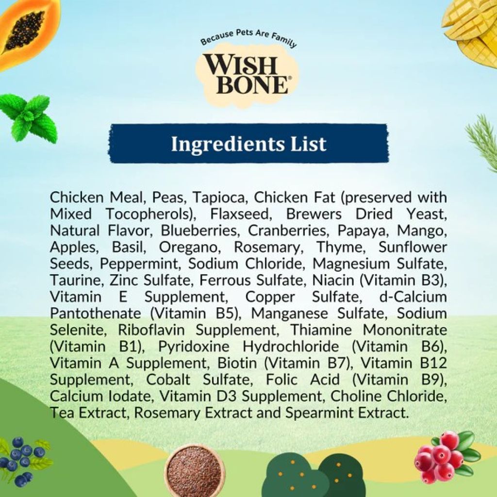 Chicken Meal, Peas, Tapioca, Chicken Fat (preserved with Mixed Tocopherols), Flaxseed, Brewers Dried Yeast, Natural Flavor, Blueberries, Cranberries, Papaya, Mango, Apples, Basil, Oregano, Rosemary, Thyme, Sunflower Seeds, Peppermint, Sodium Chloride, Magnesium Sulfate, Taurine, Zinc Sulfate, Ferrous Sulfate, Niacin (Vitamin B3), Vitamin E Supplement, Copper Sulfate, d-Calcium Pantothenate (Vitamin B5), Manganese Sulfate, Sodium Selenite, Riboflavin Supplement, Thiamine Mononitrate (Vitamin B1), Pyridoxine Hydrochloride (Vitamin B6), Vitamin A Supplement, Biotin, Vitamin B12 Supplement, Cobalt Sulfate, Folic Acid, Calcium Iodate, Vitamin D3 Supplement, Choline Chloride, Tea Extract, Rosemary Extract, Spearmint Extract.
