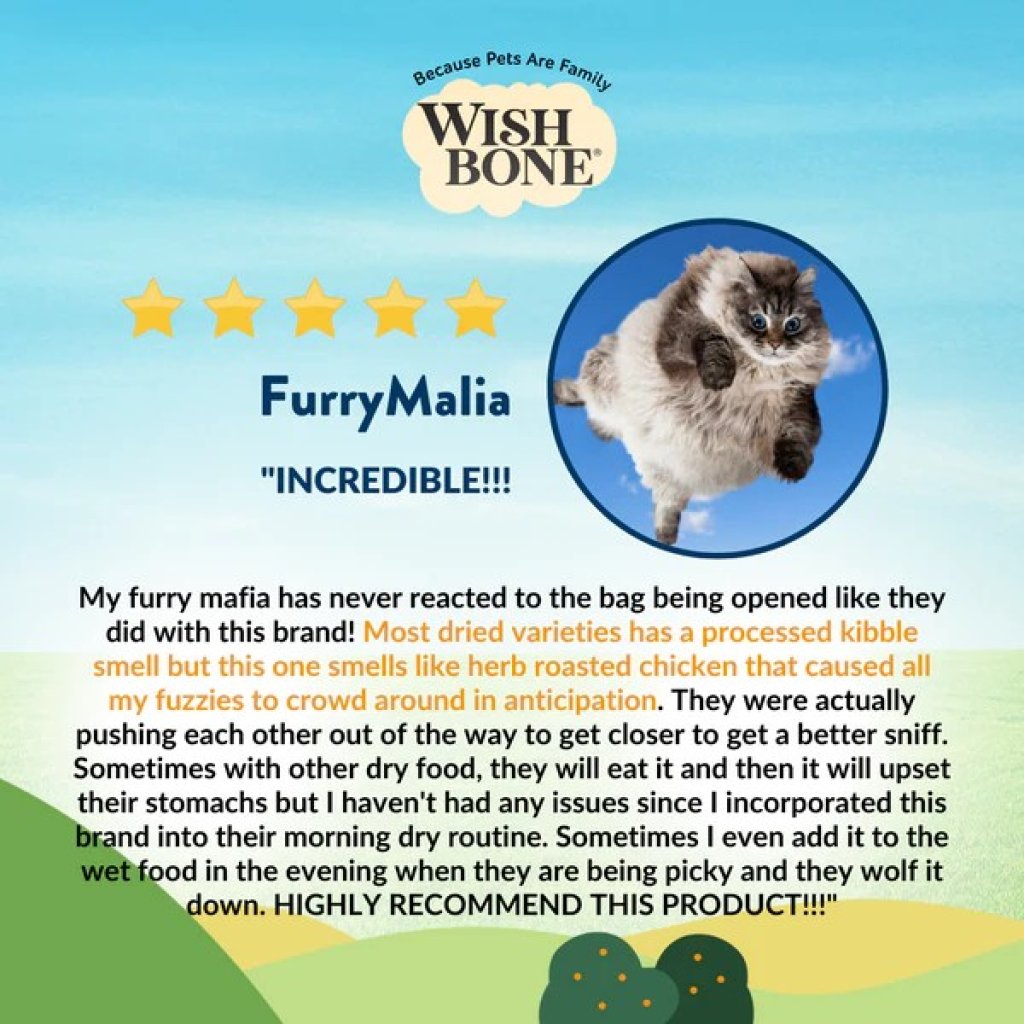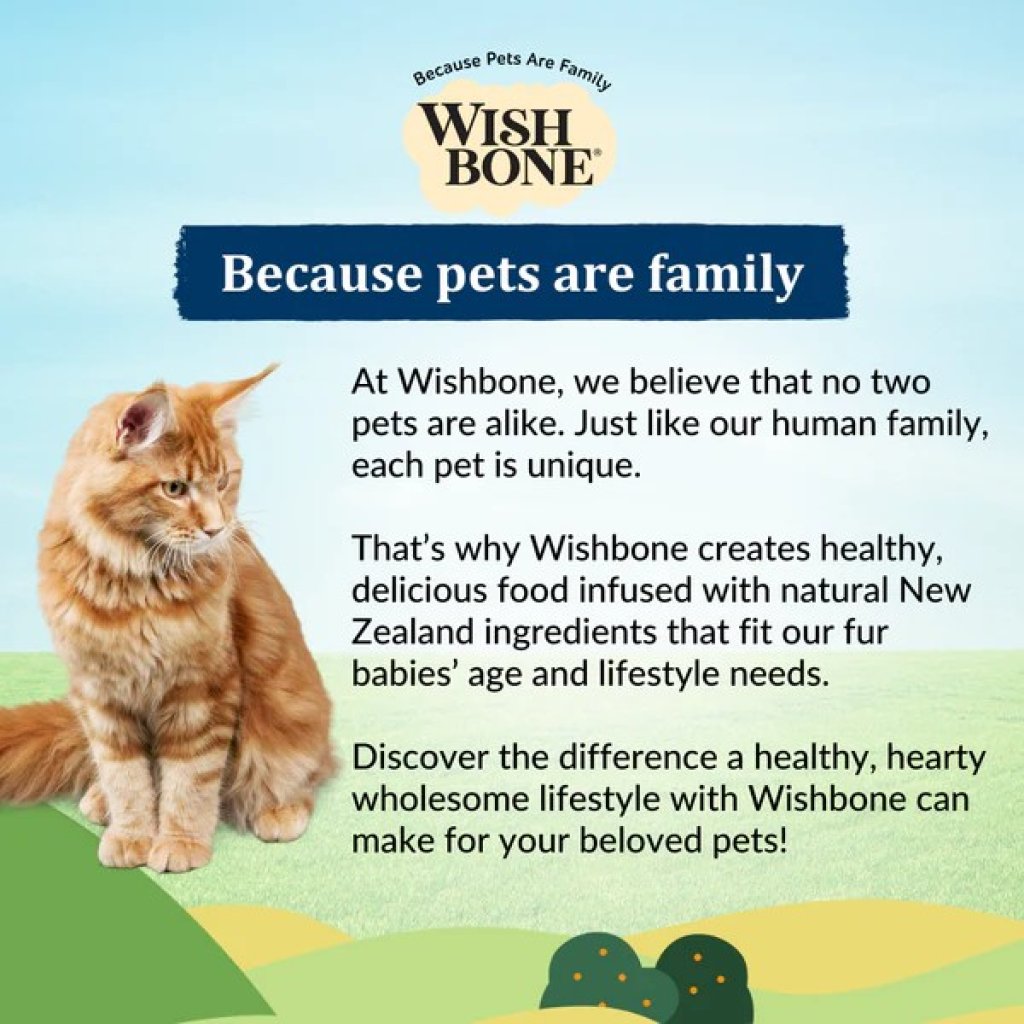 Each bag of Wishbone is expertly crafted by animal nutritionists to maintain a healthy balance of 75% animal ingredients and 25% functional ingredients. This holistic approach ensures that with this one bag, your cat eats food that supports healthy hearts, bright eyes, healthy skin, shiny coats, happy tummies and healthy muscles and bones. Now that's something to purr about!