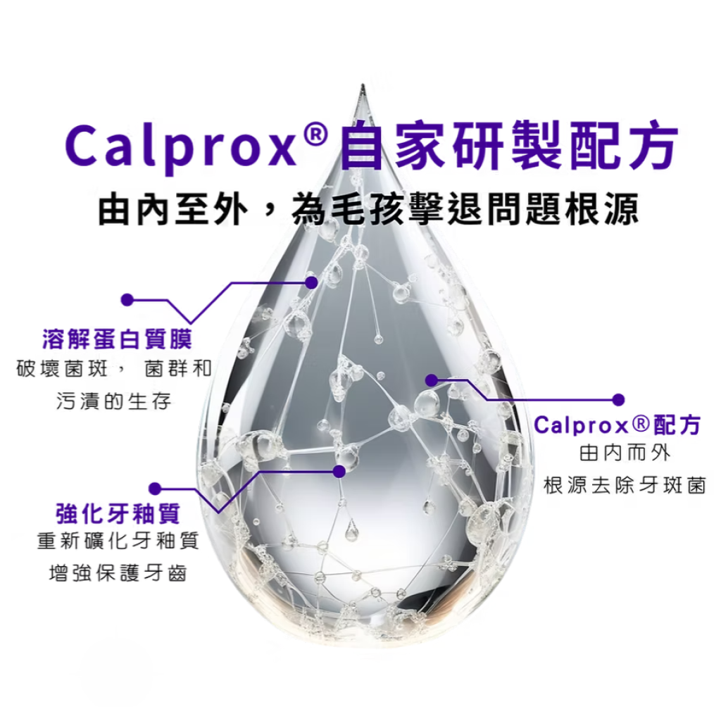 Calprox®透過溫和地溶解在寵物牙齒上形成的蛋白質表面膜,同時重新礦化琺瑯質。正是這層蛋白質表面膜才會吸附牙菌斑、細菌和污漬。如果將蛋白質表面膜留在寵物牙齒上,可能會導致蛀牙和牙周病。