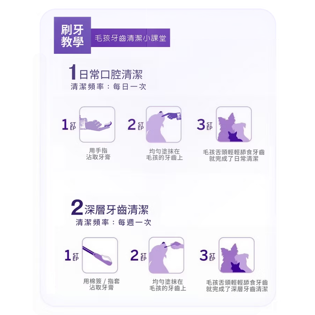 使用Petsmile去除蛋白質表面膜顯示出比普通寵物牙膏更高的62%減少牙菌斑和28%減少牙齦炎的效果。您的寵物口腔將始終保持更乾淨、更健康、呼吸更清新和牙齒更白。 Calprox®對寵物琺瑯質來說就像水一樣安全。許多貓和狗牙膏使用二氧化矽(一種類似沙子的材料),它具有很高的磨蝕性。隨著時間的推移,二氧化矽可能會使寵物琺瑯質變薄,導致敏感,並可能引發更嚴重的口腔問題。