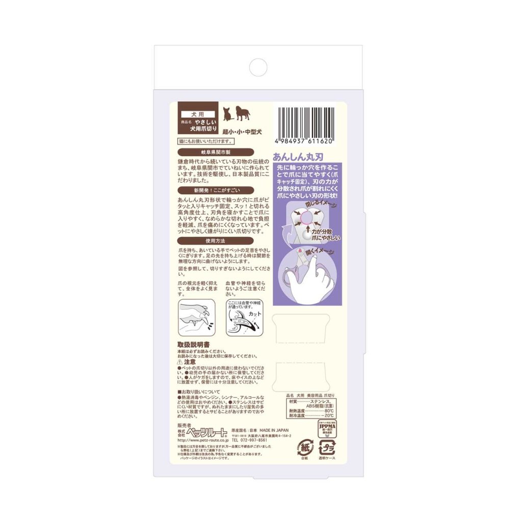 The safe, rounded blade design ensures that the nail fits snugly into the loop, securing it in place. The blade's force is distributed, preventing breakage and being gentle on the nail. The high-angle finish cuts smoothly, and the flat blade angle makes it easy to cut into the nail. The smooth cutting feel reduces strain and damage to the nail. These nail clippers are gentle on pets and are also suitable for cats. Made in Seki City, Gifu Prefecture, a city with a long tradition of cutting tools.