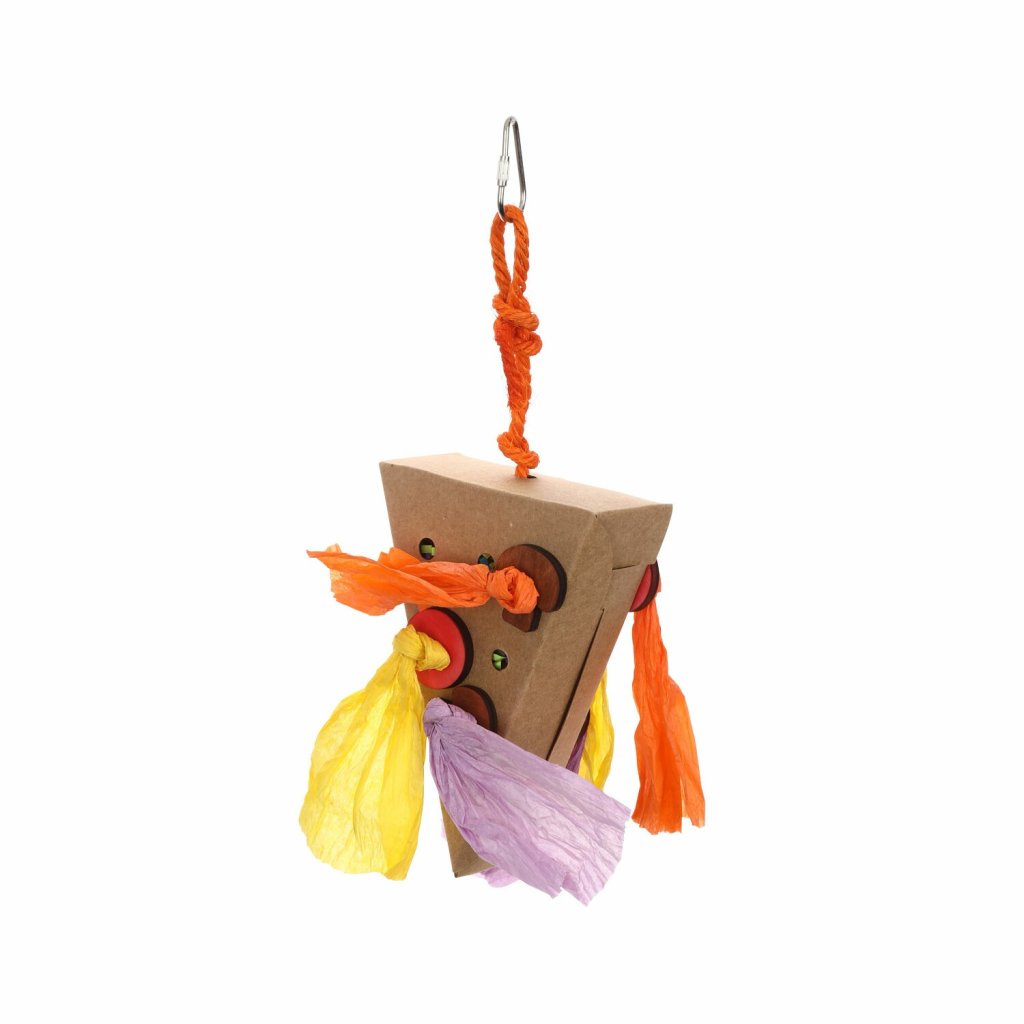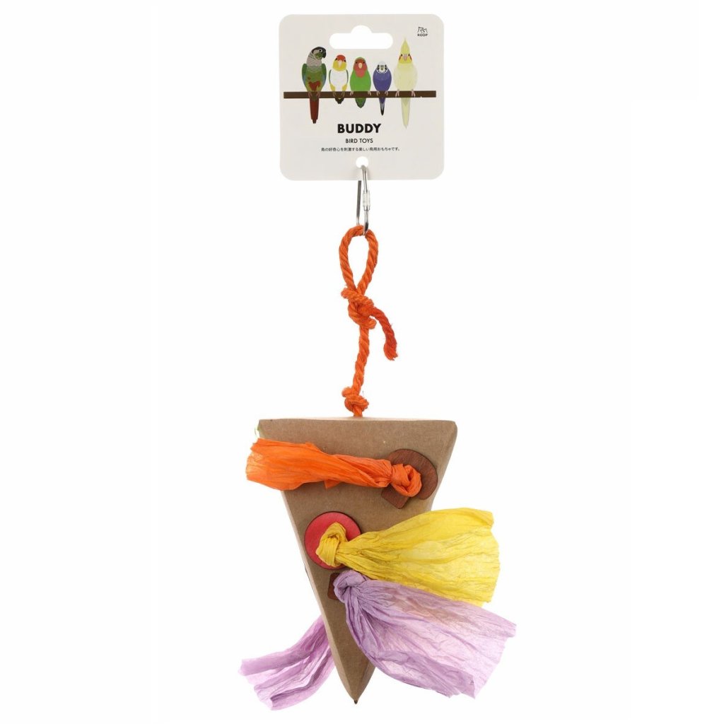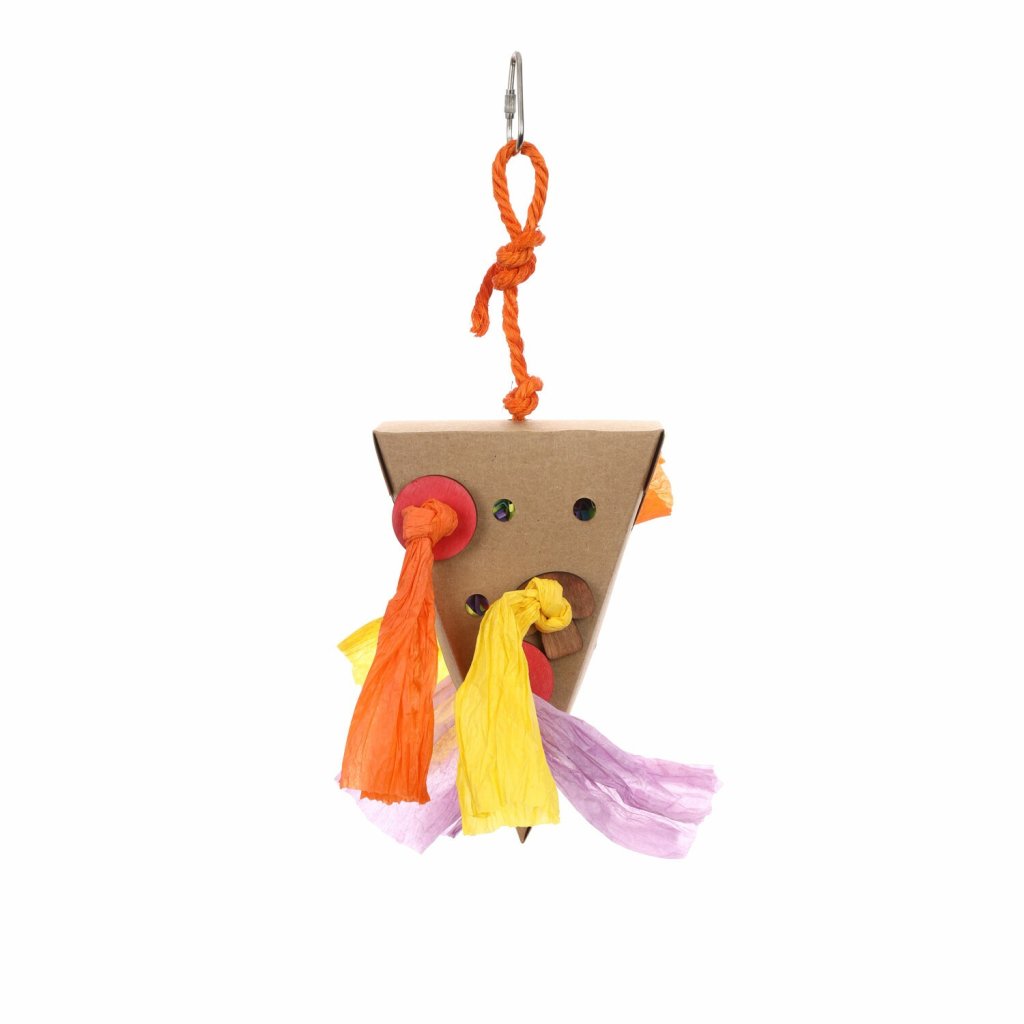 This is a fun bird toy that comes in a pizza-shaped paper box with colorful paper inside. You can enjoy two different textures: the crinkled paper that holds the wooden buttons in a knot, and the thin strips of paper inside the box. Birds have developed visual acuity and love colorful toys. It stimulates birds' curiosity and inquisitiveness, and helps relieve stress and lack of exercise. Made of paper and pinewood, it is safe for birds to peck, chew, and nibble on! The carabiner on the end makes it easy to attach to a cage.
