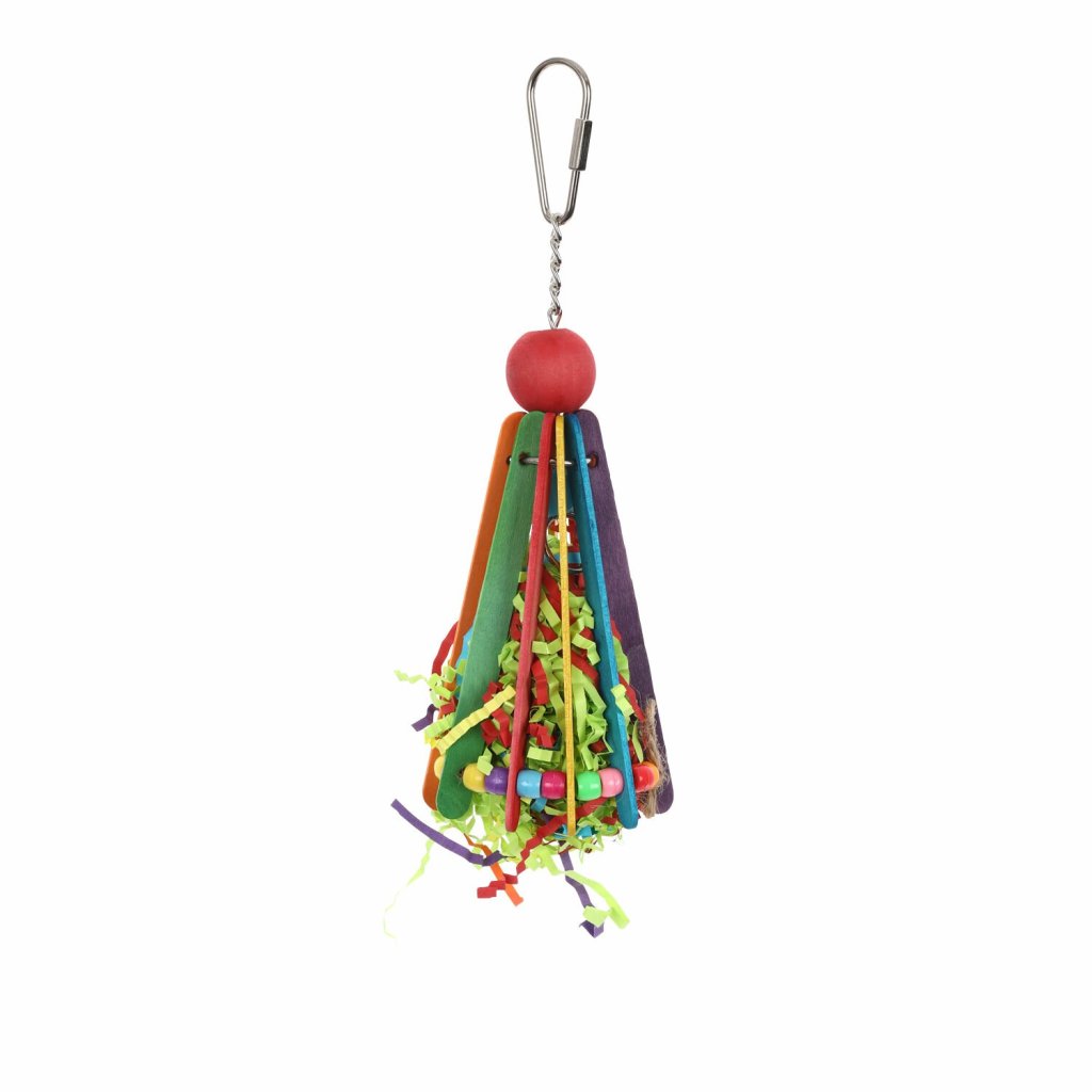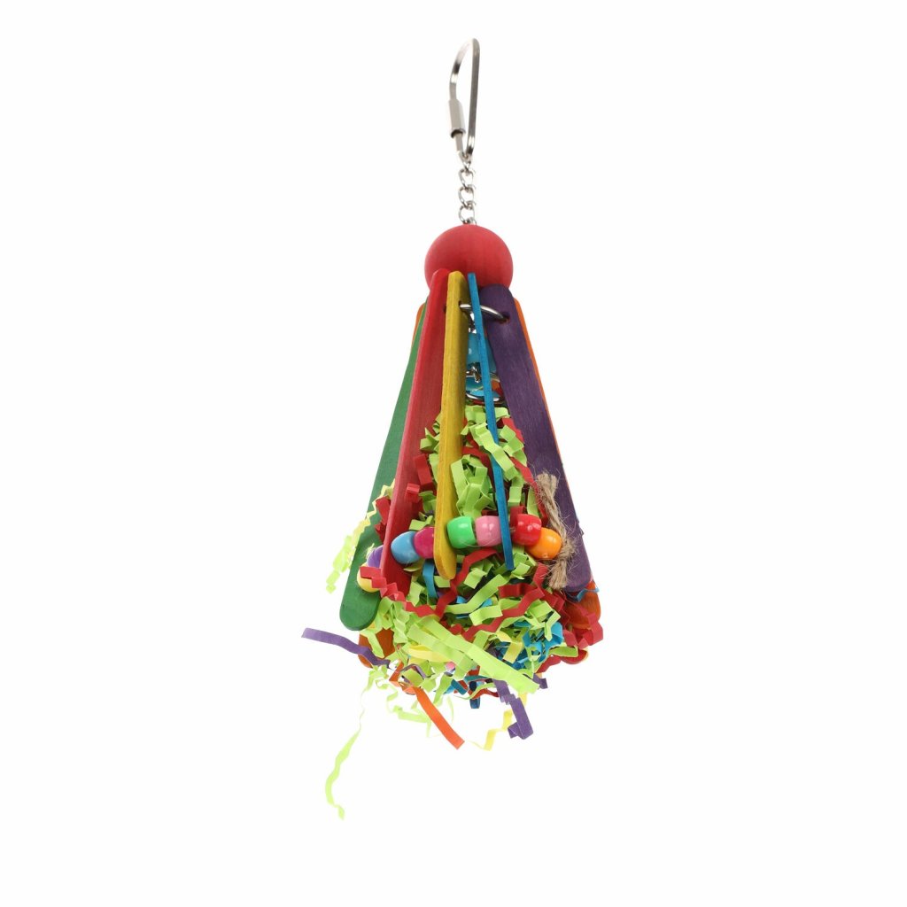 色彩鮮豔的小鳥玩具。鳥兒的視力已經發達,喜歡色彩鮮豔的玩具!它能激發鳥類的好奇心和探索意識,因為它們會尋找食物和築巢材料並啄食昆蟲,幫助它們緩解壓力並獲得更多運動。末端的登山扣可輕鬆將其固定在籠子上。