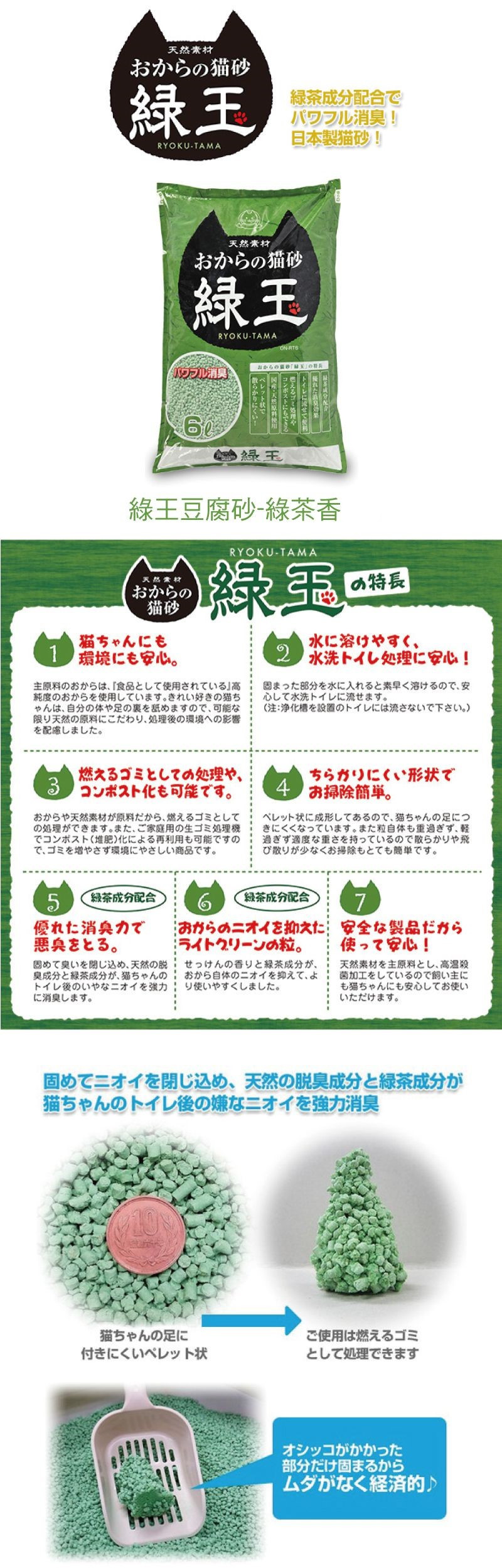 Flushable cat litter made primarily from soy pulp (contains green tea ingredients).
