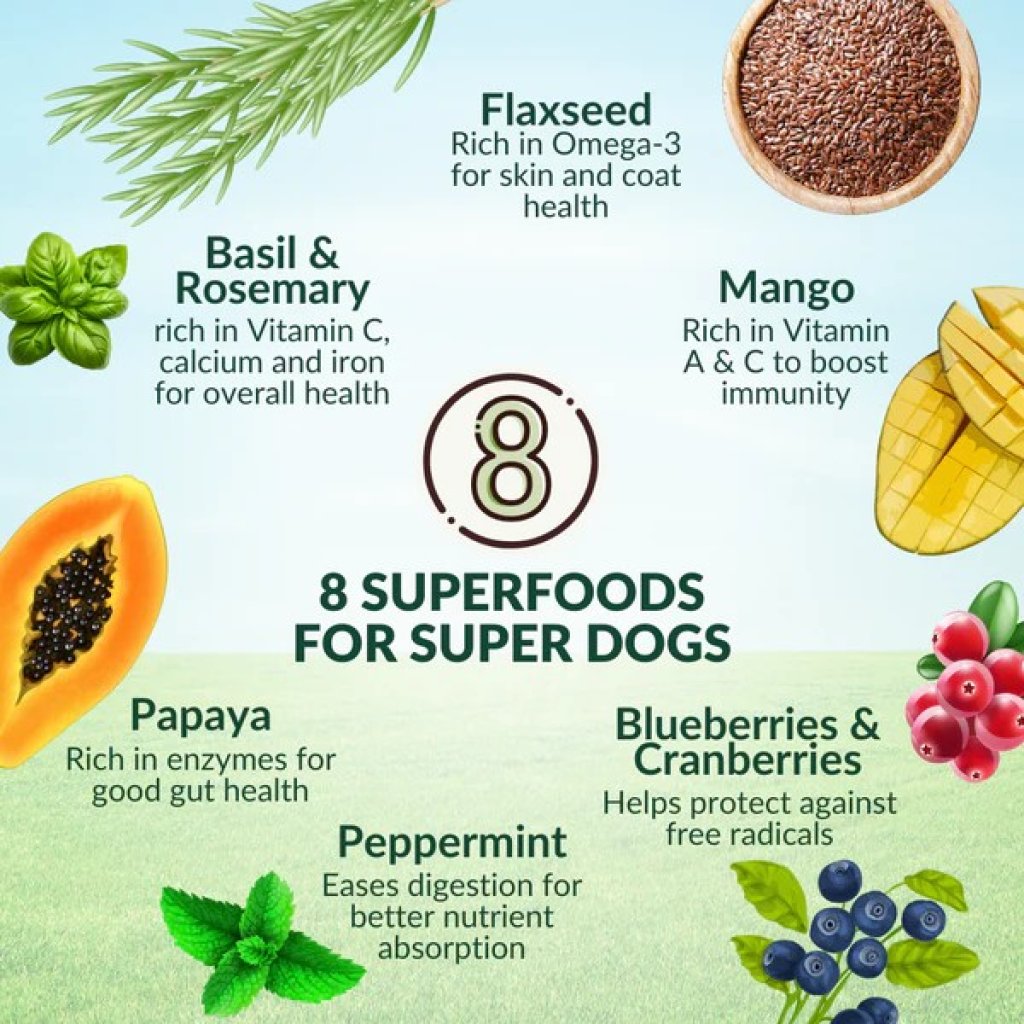 八種超級食物:包括藍莓、木瓜、迷迭香、亞麻籽、蔓越莓、芒果、羅勒和薄荷,每種食物都因其健康益處而被選擇。