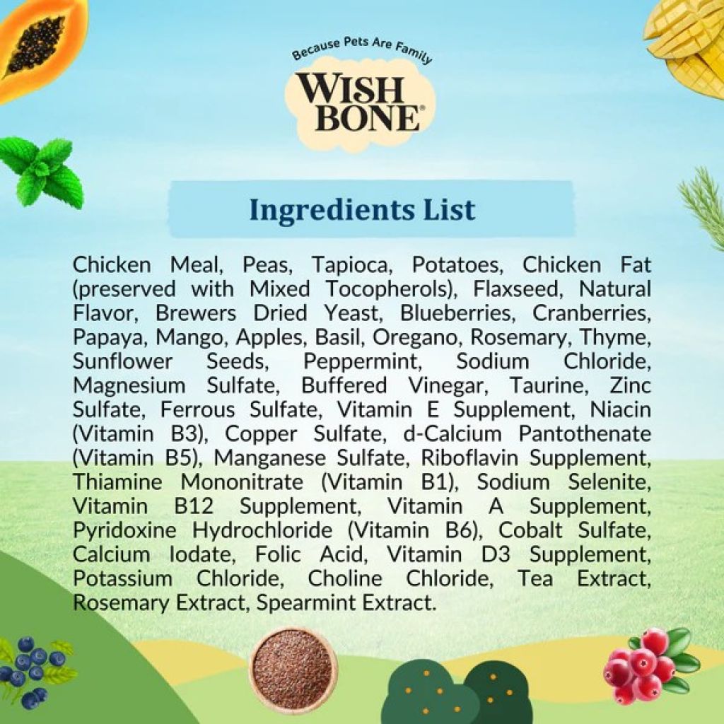 雞肉粉、豌豆、木薯、馬鈴薯、雞脂肪(用混合生育酚保存)、亞麻籽、天然香料、啤酒乾酵母、藍莓、蔓越莓、木瓜、芒果、蘋果、羅勒、牛至、迷迭香、百里香、葵花籽、薄荷、氯化鈉、硫酸鎂、緩衝醋、牛磺酸補充劑、硫酸鋅、硫酸亞鐵、維生素 E 維生素、菸酸維生素 B36-33-130-93ii 維生素)(維生素 B 1)、亞硒酸鈉、維生素 B12 補充劑、維生素 A 補充劑、鹽酸吡哆醇(維生素 B6)、硫酸鈷、碘酸鈣、葉酸、維生素 D3 補充劑、氯化鉀、氯化膽鹼、茶萃取、迷迭香萃取、留蘭香萃取物。