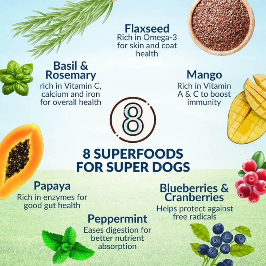 八種超級食物:包括藍莓、木瓜、迷迭香、亞麻籽、蔓越莓、芒果、羅勒和薄荷,每種食物都因其健康益處而被選擇。